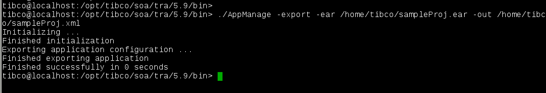 ./AppManage -export -ear /home/tibco/sampleProj.ear -out /home/tibco/sampleProj.xml