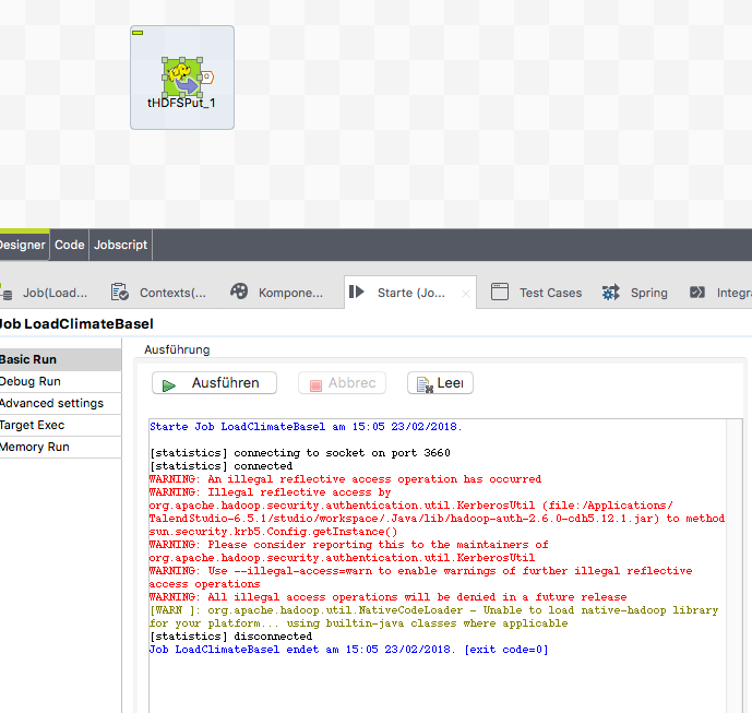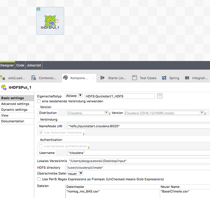Hierfür erstellen wir einen neuen Standard Job mit dem Namen LoadClimateBasel. Als einzige Komponente für den Job konfigurieren wir tHDFSPut. Mit der Komponente können wir eine Datei vom lokalen Dateisystem nach HDFS kopieren.