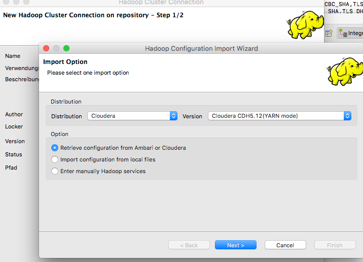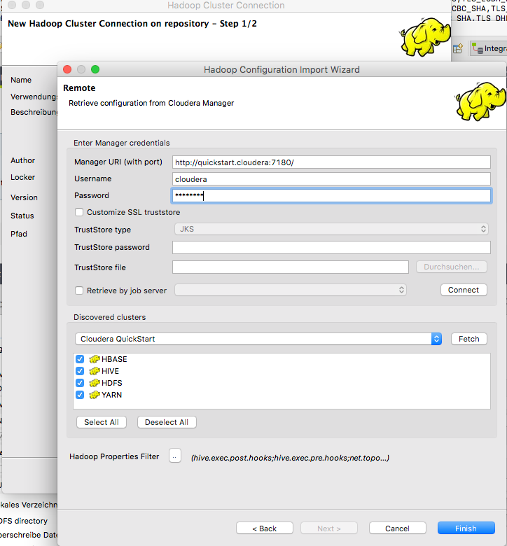Anschließend geben wir die Manager URL, sowie die Anmeldeinformationen ein und klicken auf Fetch: dies wird Open Studio anweisen, sich mit dem Cluster zu verbinden und die Konfigurationseinstellungen für HDFS, YARN und andere Hadoop-Dienste herunterzuladen. Als Anmeldeinformationen geben wir folgendes ein: Manager URI (with port): http://quickstart.cloudera:7180/ Username: cloudera Password: cloudera