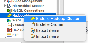 Nun können wir das Open Studio mit dem Quickstart Container verbinden. Im Talend Open Studio navigieren wir zu Metadaten | Hadoop Cluster, klicken dann mit der rechten Maustaste und wählen Create Hadoop Cluster.